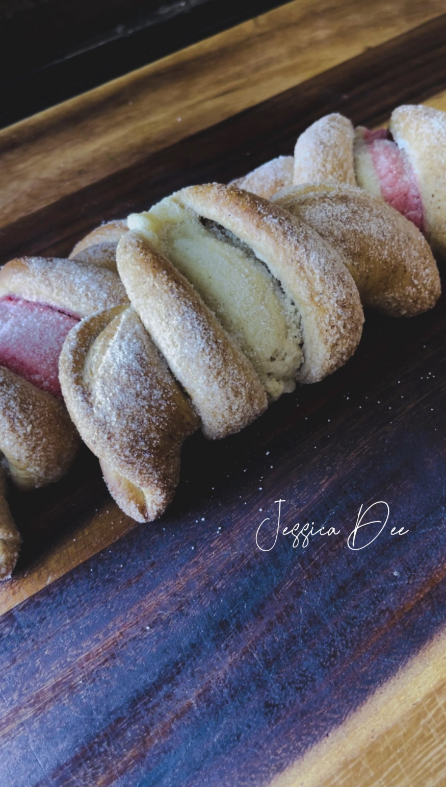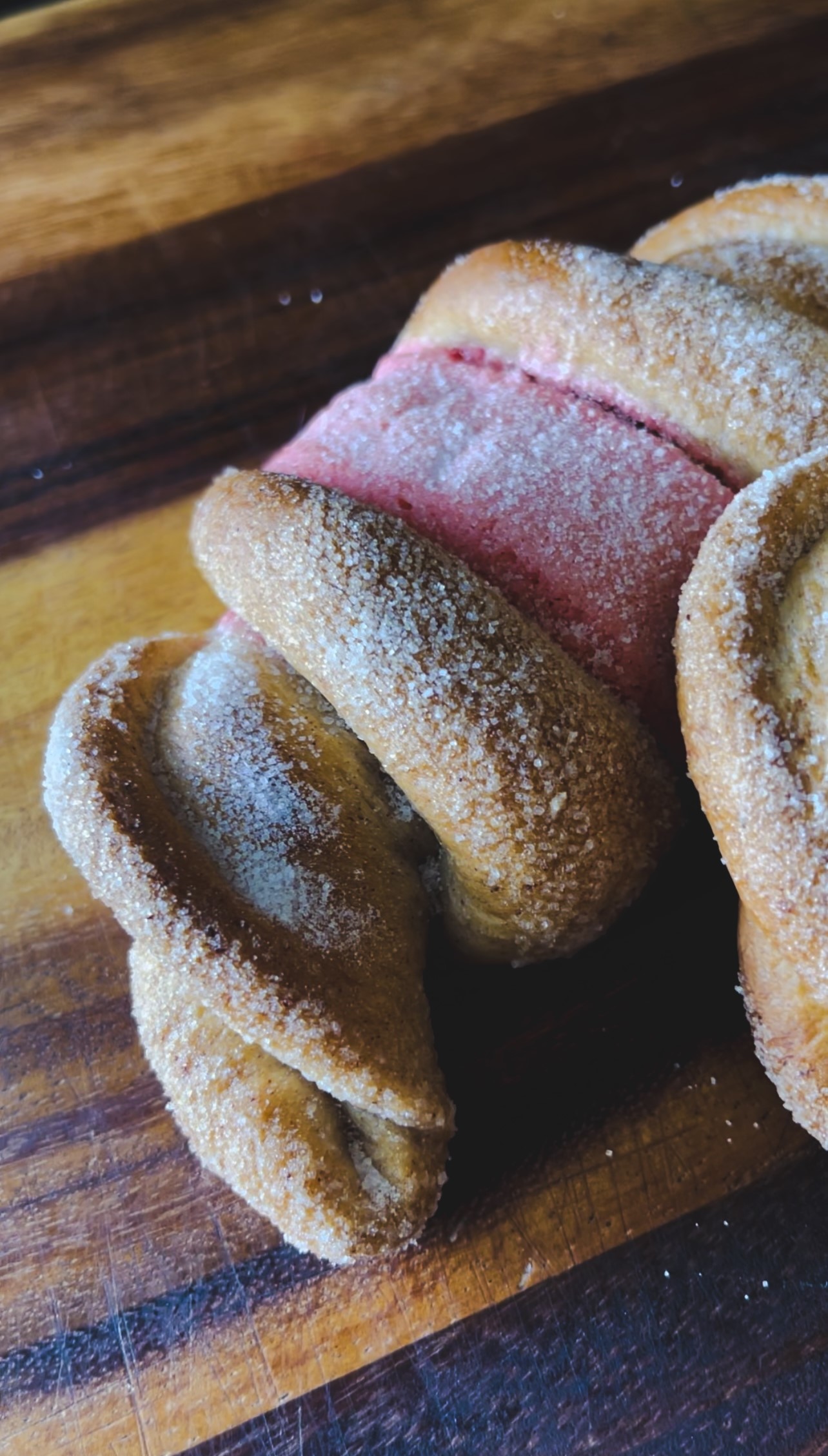 - Mix flour, sugar, yeast and cinnamon in a mixing bowl. Using a mixer and bread hook attachment, add butter. Add water a little at a time, dough should not be sticky. Knead dough until the dough comes together, about 2-3 minutes. Place dough in lightly oiled bowl and cover, let proof for 20 minutes. Punch air out and separate dough into 6 equals pieces. Roll dough into balls and let proof again for 15 minutes.While proofing, make cookie topping. Combine and mix unsalted butter, powdered sugar, flour and vanilla extract. Divide cookie topping into 6 equal pieces. Roll bread dough piece into an oval shape. Place cookie topping on top of bread dough. Using rolling pin, roll the cookie topping into the dough. Starting at the top, roll sides in, working your way down into the shape of a triangle. Leave about an inch at the bottom, unrolled. Flip the bread over, flat part at top. Roll the dough downward until you reach the tip of the triangle. Dip bread into sugar, Place bread on parchment lined baking pan. Proof 20 minutes. Bake at 350 F for 20 minutes.