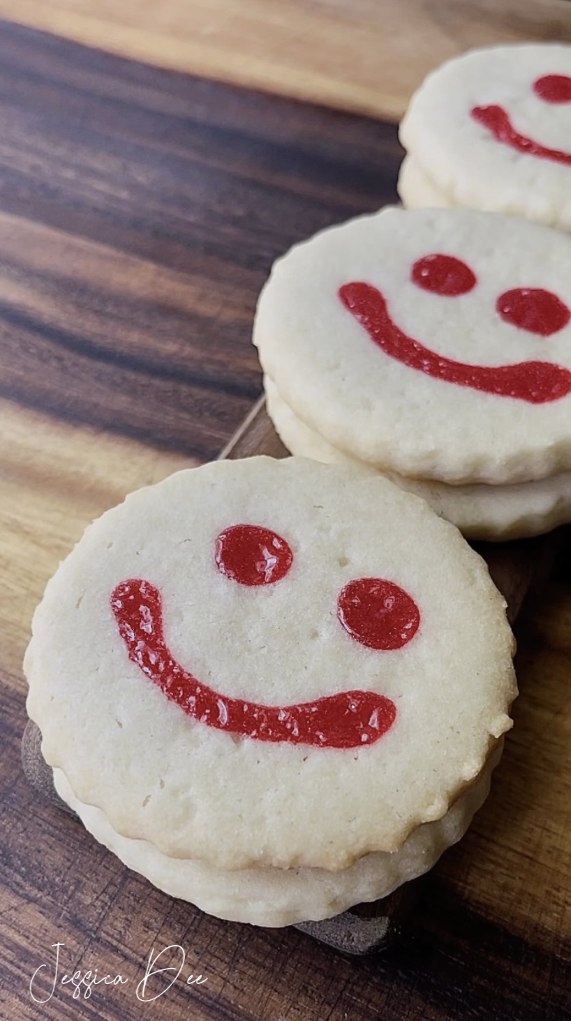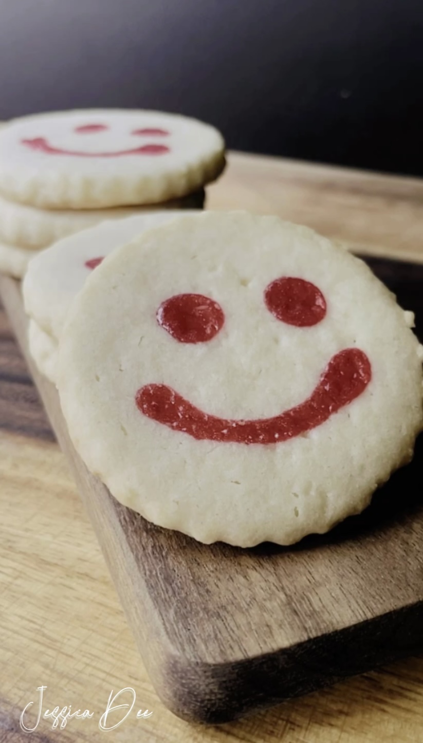 - In a mixing bowl combine: butter, granulated sugar, powdered sugar and vanilla extract. Set aside. In another bowl combine: all-purpose flour and salt. Set aside. Using paddle attachment, mix butter mixture. Start on a low speed and work your way up to a medium. Mix for 2 minutes. Add flour to butter mixture a little at a time until all ingredients are incorporated. You should get a soft cookie dough mixture. Form cookie dough into a ball, place in a bowl and set in the refrigerator for 10-15 minutes. This will help the butter harden a little so that it can be easier to work with. Place the dough between two big pieces of parchment paper and press down with your hands. Next, use rolling pin to roll dough into a 1/4-inch thickness. Preheat oven to 325 degrees FCut out the cookies with a cookie cutter. Place them on a parchment lined cookie sheet. Draw a smiley face on each cookie with red gel. Bake for 12-14 minutes. Let cool on sheet for about 5 minutes, they move to rack to cool.