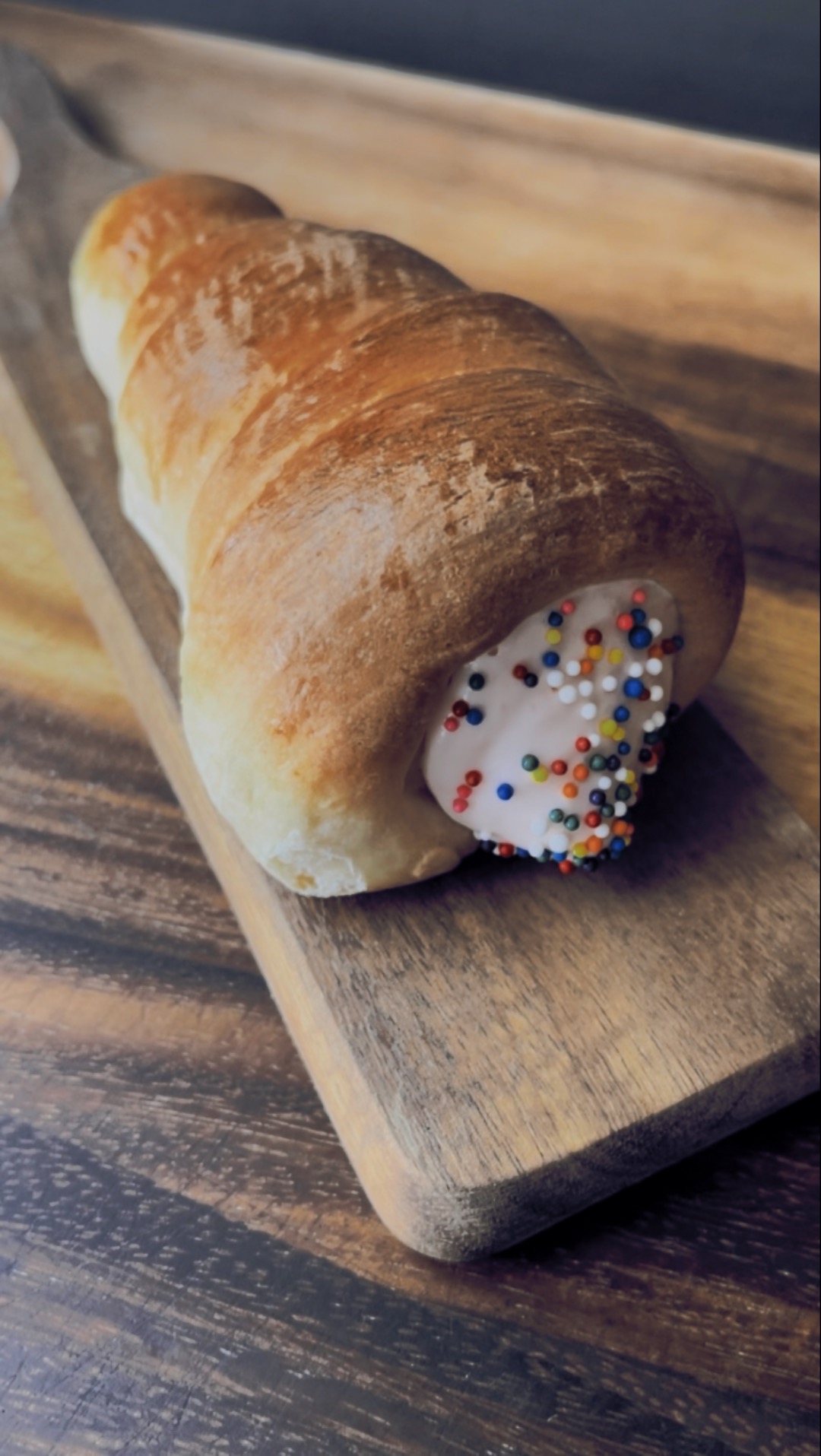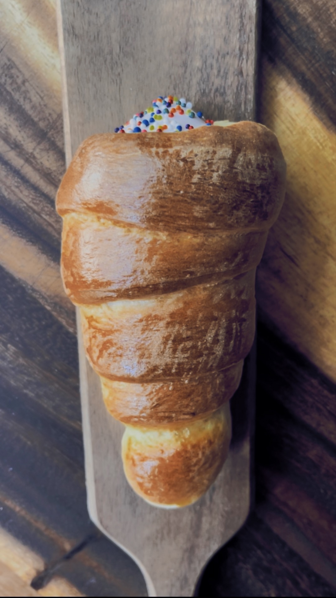 - Add flour, sugar, yeast and salt in mixer bowl. Mix ingredients with a whisk to incorporate dry ingredients.Use dough hook attachment. Add butter, egg, vanilla and water to flour mixture using low speed. Once ingredients are brought together, knead dough for 8 minutes. Lightly flour a working surface and bring dough together, forming a ball. Place dough in a bowl, cover and proof 20 minutes. Butter a working surface and place dough on top. Carefully press and stretch dough into a 12"x8" rectangle. Using pizza cutter, cut 10 long strips, starting at the bottom. The pieces don't have to uniform. Using baking cones, place the tip of the cone at the one of the ends. Gently roll and slightly overlap dough, making your way up the baking cone until you've reached the end. Place all of the cones on a parchment lined baking sheet. Let proof for 20 minutes. Using pastry brush, brush egg wash on top of cones. Bake at 350F for 20 minutes. Let the dough cool down and remove the baking cones. Using piping bag, fill the cones. Place cones in an airtight container and put in the refrigerator. The cool cones taste really good on a hot day. Especially here in Texas.