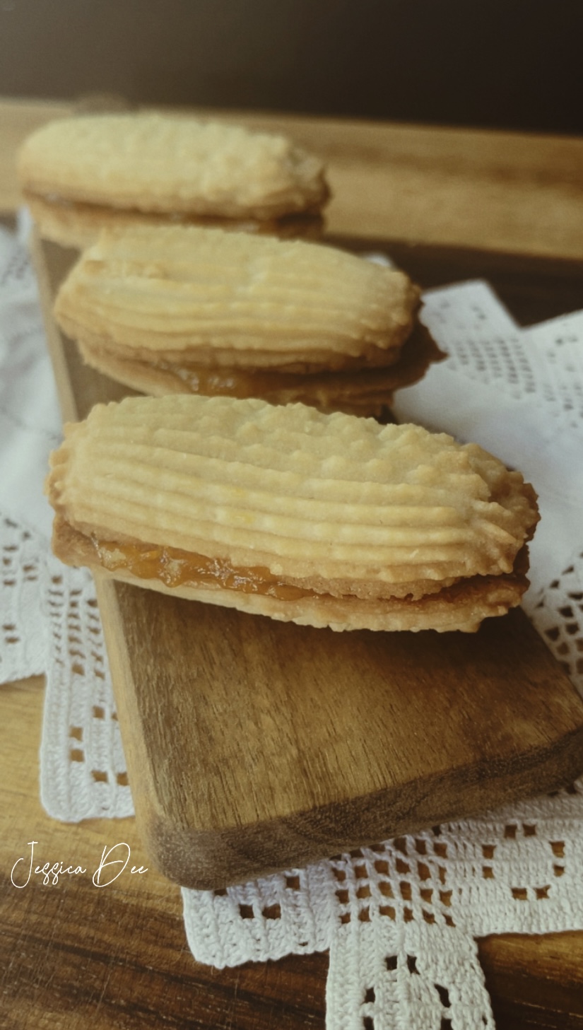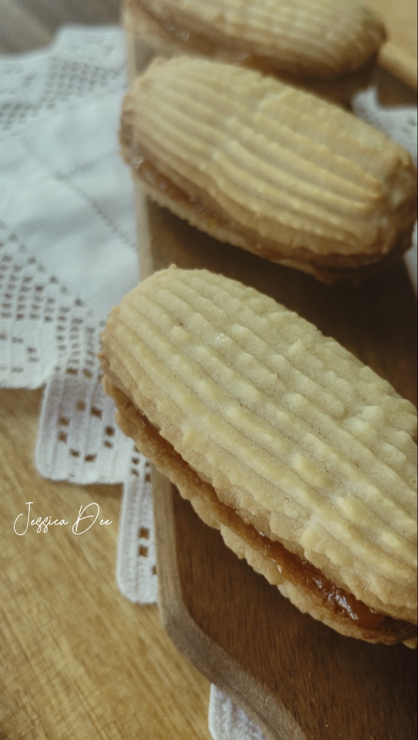 - Preheat oven to 350F Beat butter, sugar & vanilla until fluffy. Gradually add flour and mix until it comes together. Then add milk until entire dough is well incorporated. Place the dough in a large pastry bag with a large tip. Pipe dough onto a silicone lined baking sheet. Make dough strips about 1to 1 1/2 inches long. Bake cookies for 15 minutes, until golden. Cool completely, 15-30 minutes. Apply a small amount of jam in center of one cookie and place the other cookie on top. Gently press down. Enjoy!