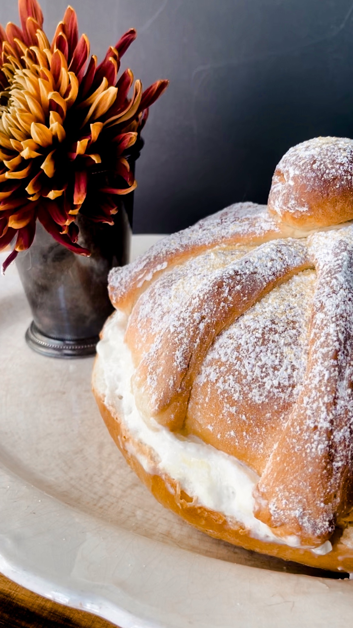 - In mixing bowl: combine flour and sugar, mix with whisk. Using dough attachment: add eggs one at a time until incorporated. Add butter a little a time until combined. Add yeast mixture, orange extract & orange zest. Lastly, add fresh orange juice in increments. Knead dough 8-10 minutes. The dough should stretch when pulled. Place dough in a buttered/oiled bowl. Lightly butter top of dough. Cover and proof in warm place 1 1/2 -2 hours. Remove dough and separate into two equal pieces. Cut a quarter off of each piece. Form two larger pieces into balls and place on parchment lined baking sheet. Separate small dough into 5 smaller pieces. Form 4 pieces into strips (bones) & 1 into a small ball (tear). Repeat with additional piece. Proof all pieces for 1 hour. Preheat oven to 320F.Drape bone pieces like crossbones over the large dough balls. Then, add small ball on top and gently press down. Optional: brush bread with milk before baking. Bake for 35-40 minutes.Dust a generous amount of powdered sugar.