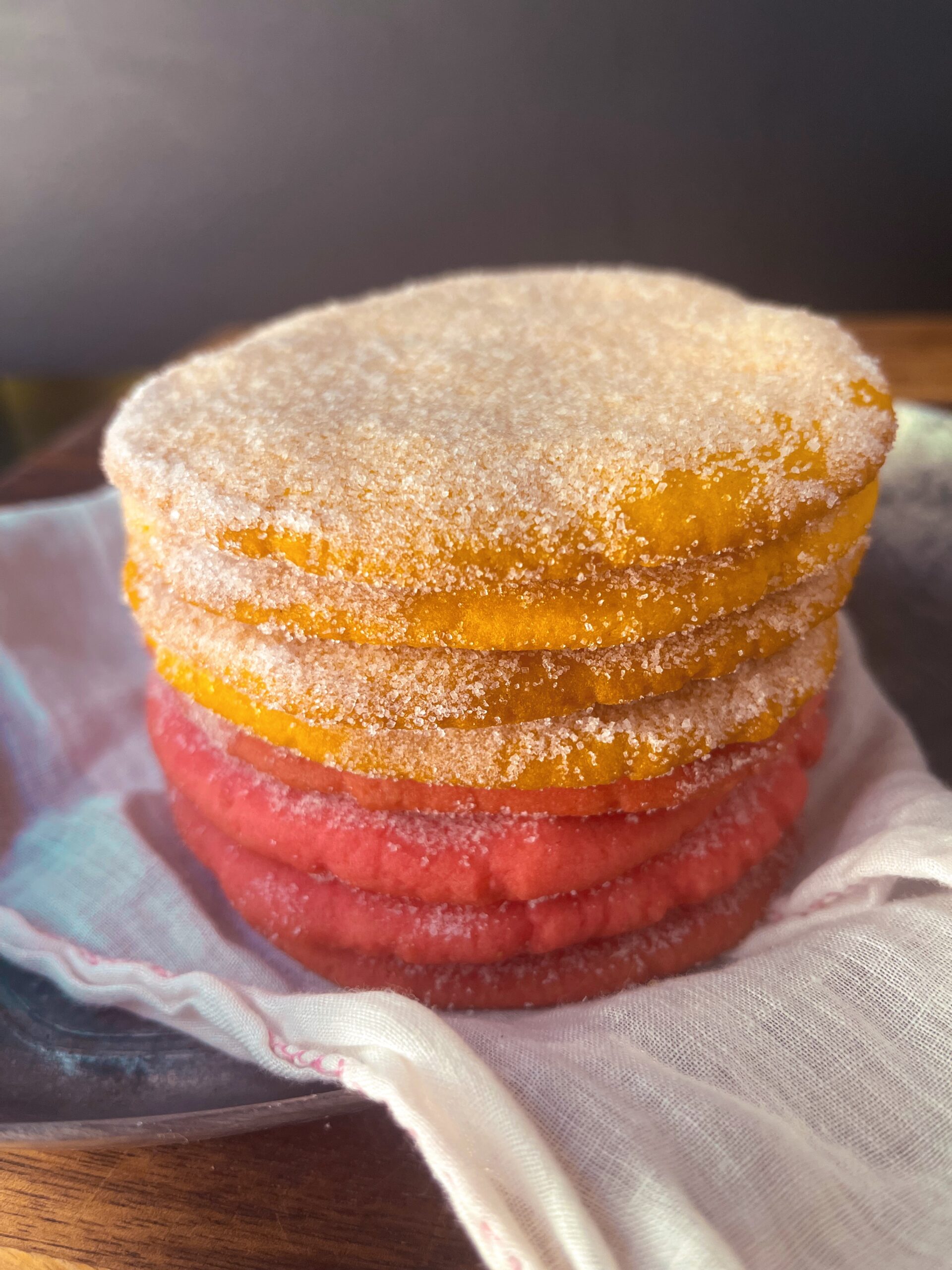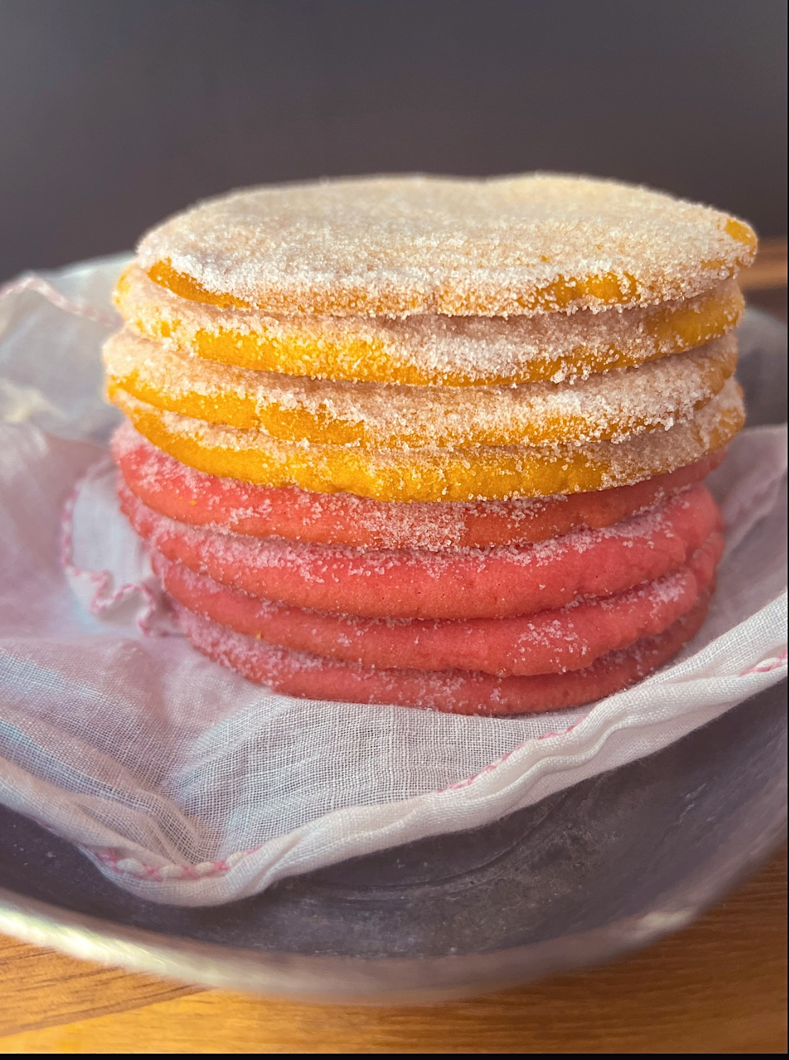 - Sift all dry ingredients together in a medium bowl. Set aside. In a mixer bowl: Combine butter, vanilla extract and egg. Mix on medium with paddle attachment, 1 minute. Bring speed down to low and gradually add flour to the butter mixture. Once all of the flour is added, mix for about 2 minutes. You should get a cookie dough consistency. **If you're making the cookies the same color, then you can add food coloring while dough is still mixing.**Separate dough into two different bowls and add food coloring. Incorporate food coloring into dough by hand. Place each dough in plastic and place in refrigerator for 30 minutes. Preheat oven to 350F. Remove one ball of dough from refrigerator, leave the other in fridge to keep cool. Separate dough into 12 equal pieces, roll each into a ball. Place each ball on a parchment lined cookie sheet. Using the palm of your hand, press down on dough until you get a round cookie shape. Bake 10-12 minutes. Continue with the remaining dough. While cookies are still warm, carefully dust sugar on top. Place cookies on cooling rack. Enjoy!