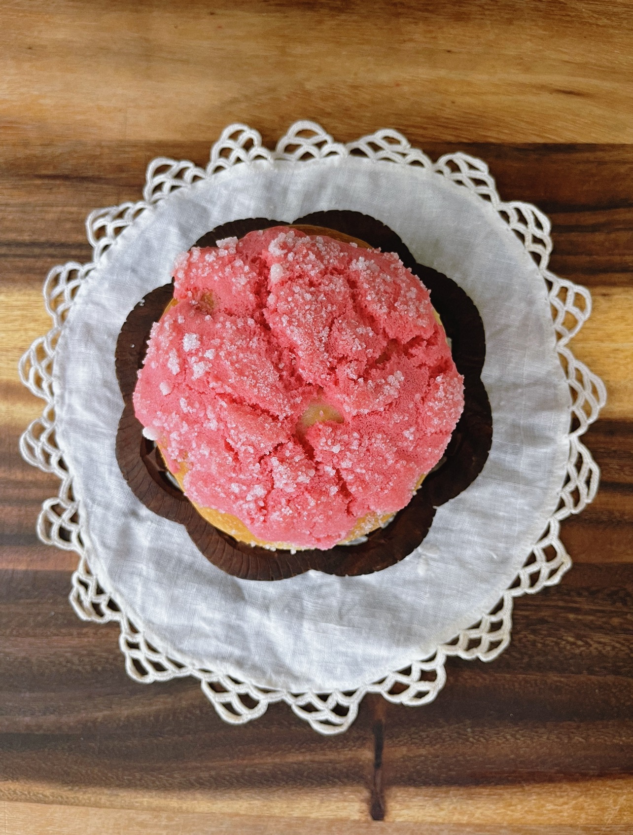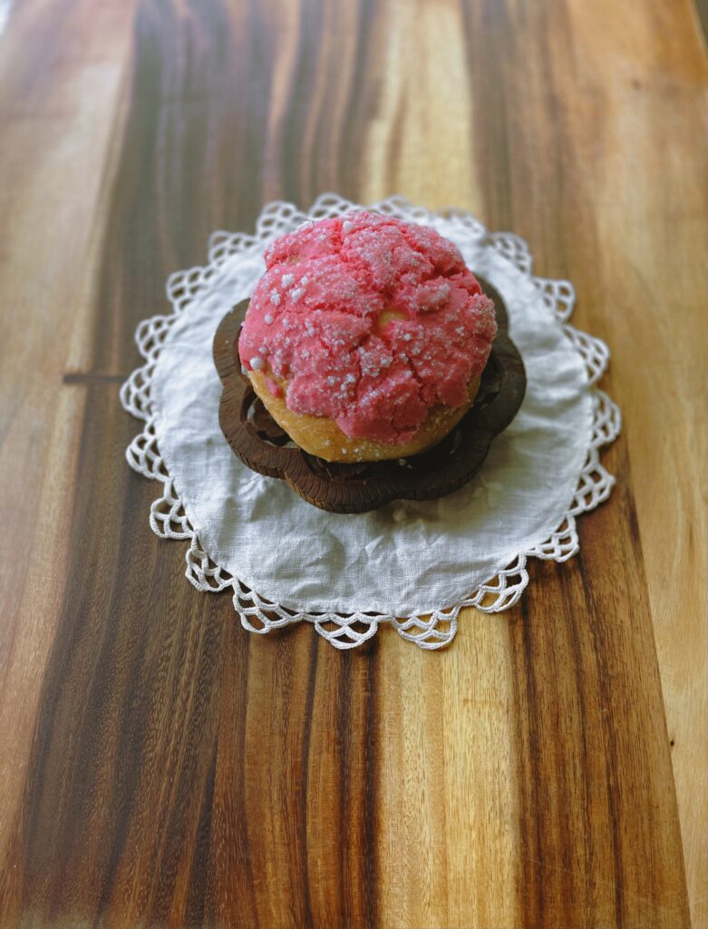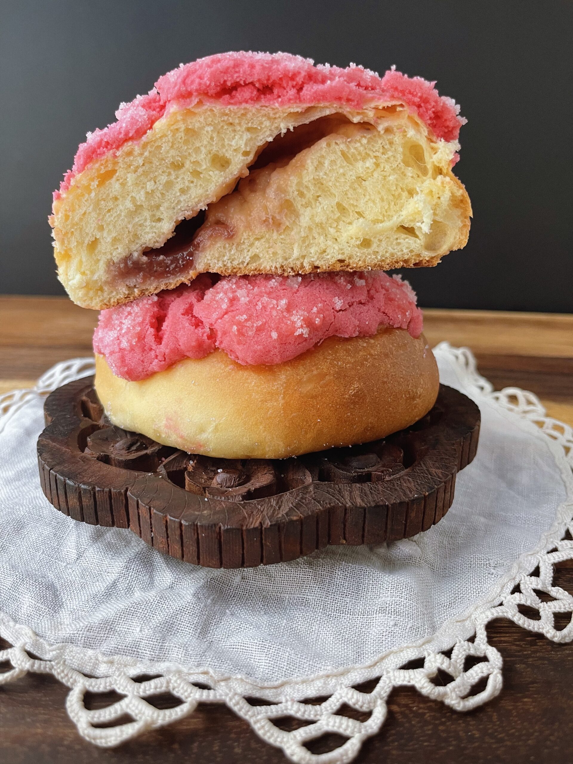 This soft yeast bun has a crunchy concha-like paste on top with a filling in the middle. This is probably one of my favorite breads. It’s kind of like a concha, but with a softer bread and crunchier sugar topping. You can add a fruit preserve or cream filling in the center, I chose a strawberry preserve for this recipe.